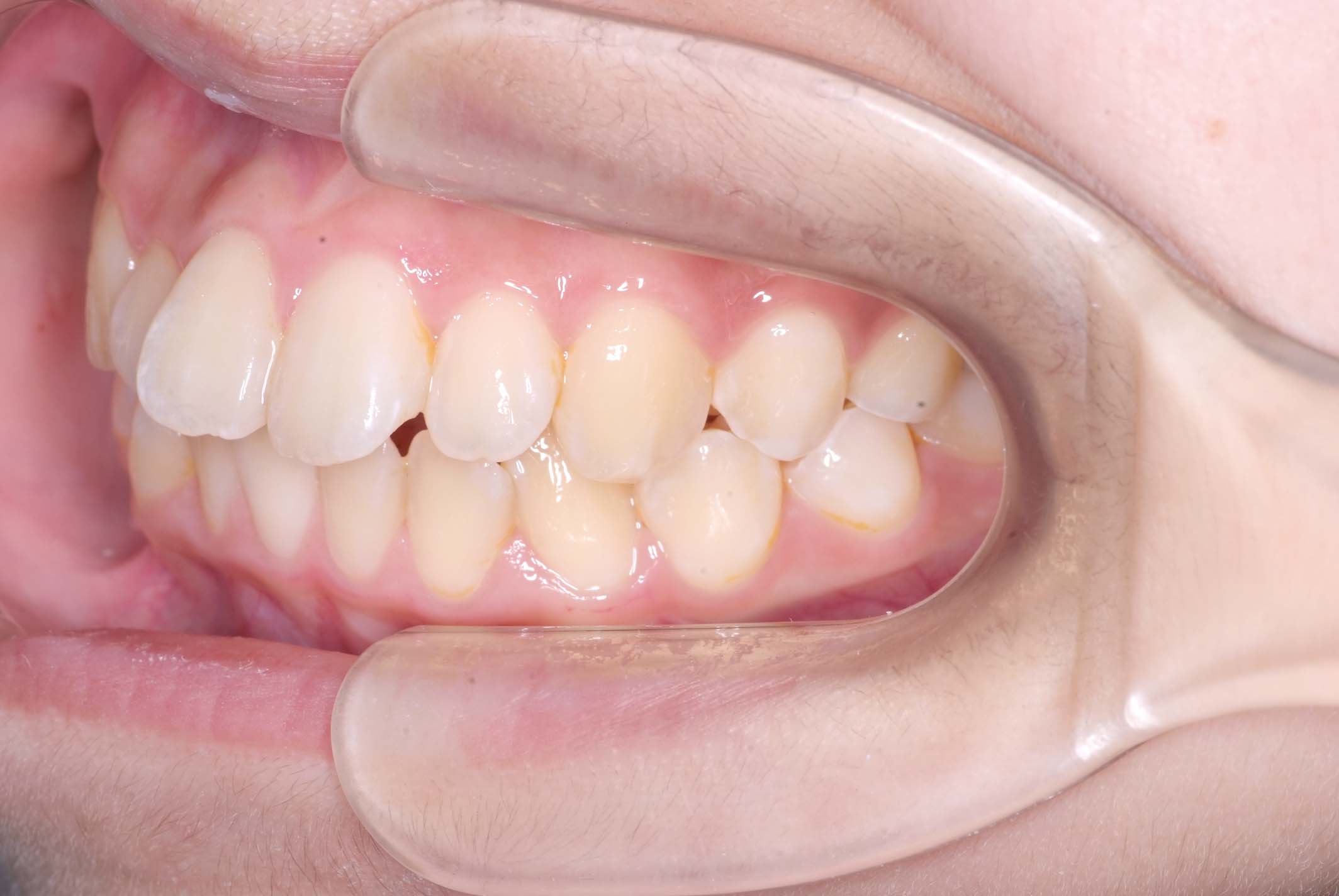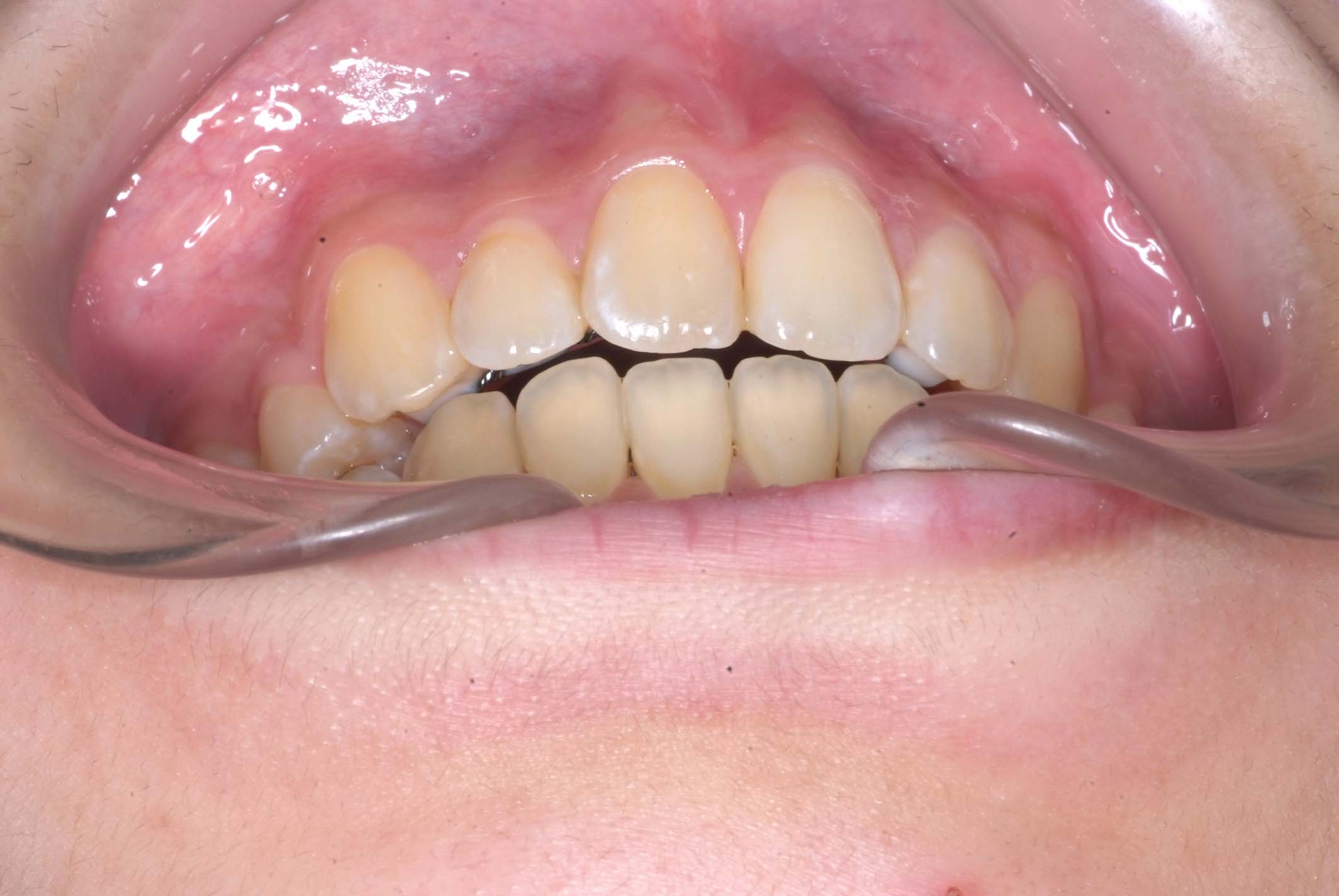 検査の結果、前歯部開咬と正中離開と上下顎前歯唇側傾斜を伴うアングルⅡ級1類不正咬合と診断しました。